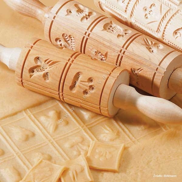 Drewniany, ręcznie rzeźbiony wałek do wytłaczania wzorów na ciasteczkach