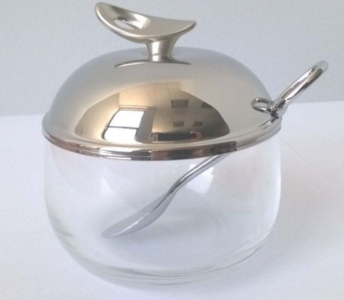 Cukiernica wykonana ze stali nierdzewnej 18/10 o wysokim połysku oraz szkła.