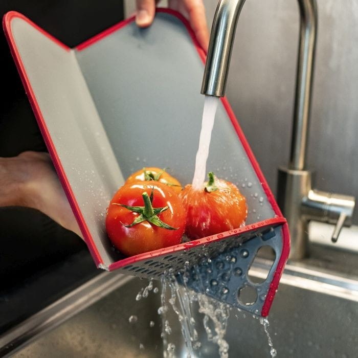 Deska do krojenia idealnie nadaje się do krojenia owoców i warzyw. Można łatwo złożyć, dzięki czemu idealnie nadaje się do przenoszenia owoców i warzyw do innego pojemnika lub mycia ich i odcedzenia. Miękka krawędź zapewnia antypoślizgowy chwyt. Po użyciu deskę do krojenia można łatwo umyć w zmywarce.