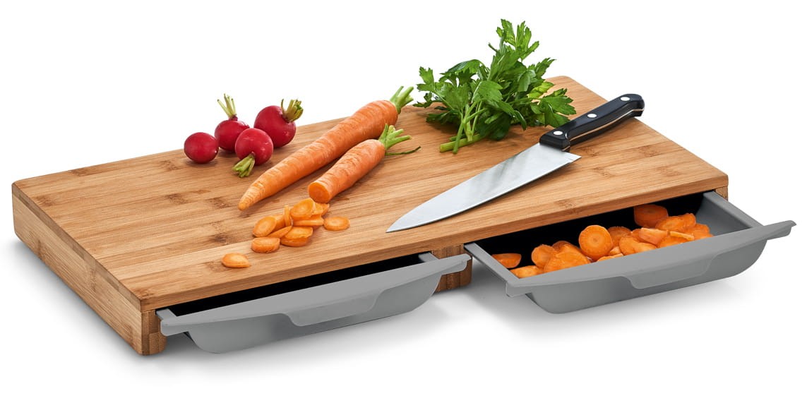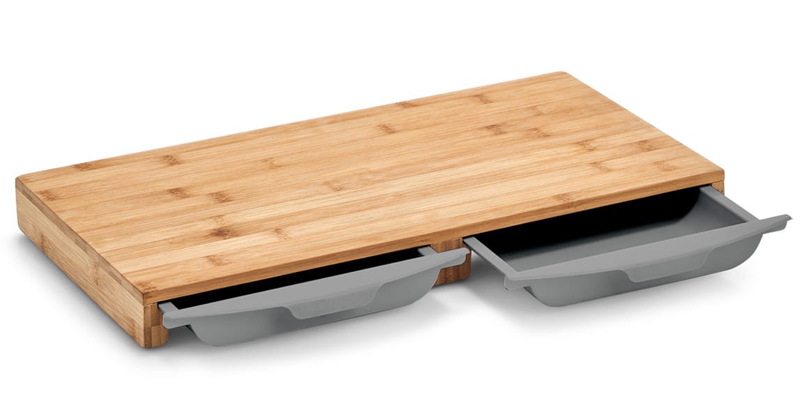 Deska do krojenia z wysuwanymi pojemnikami na pokrojone produkty lub resztki pozostałe z czyszczenia warzyw i owoców w trakcie krojenia.