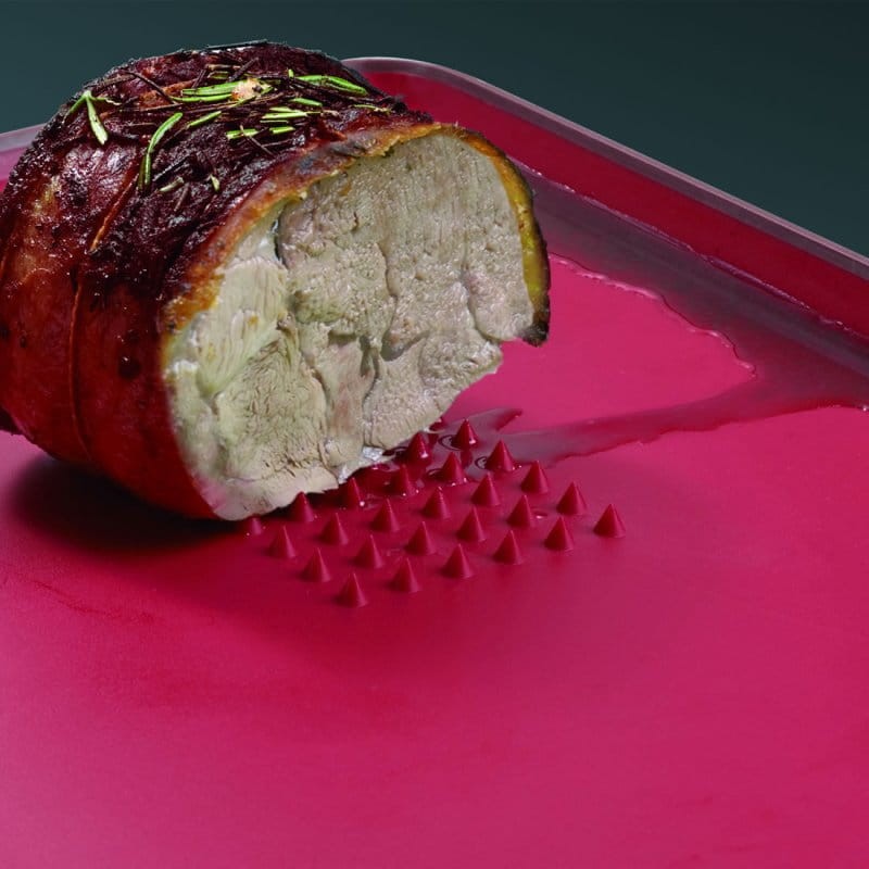 Powierzchnia deski Cut&Carve Plus jest nachylona pod niewielkim kątem. Dzięki temu soki lub okruszki zbierają się w niższej części deski. By je usunąć, wystarczy przechylić róg.