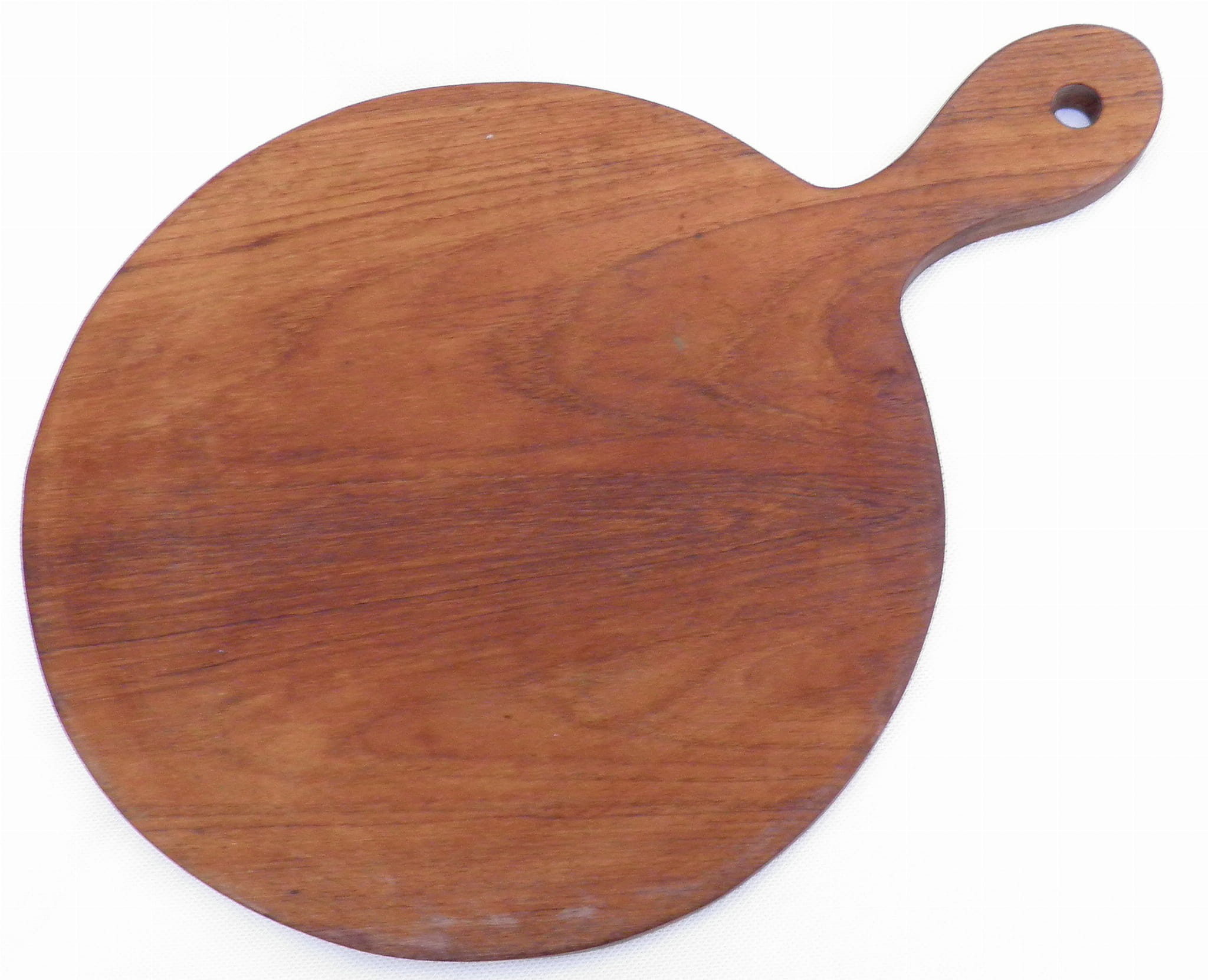 Ozdobna deska dekoracyjna do krojenia lub serwowania przystawek, wykonana z drewna teakowego. Deska ma okrągły kształt i uchwyt.