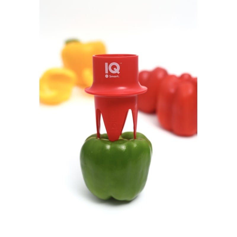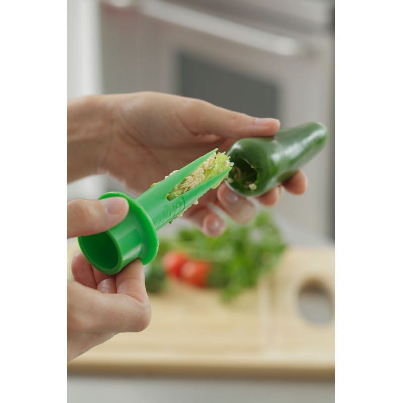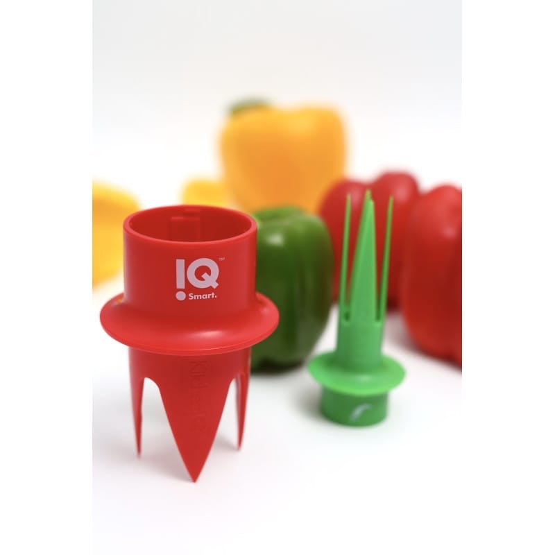 Drylownica do papryki marki KitchenIQ składa się z dwóch wydrążarek, dzięki którym z małej i dużej papryki pozbędziesz się pestek w sekundy. Wystarczy włożyć narzędzie w gniazdo papryki, obrócić o 360 stopni i pociągnąć, aby usunąć rdzeń i nasiona. Czerwony trybownik nadaje się do większych papryk, a zielony do mniejszych. Jest do gadżet idealny dla wszystkich lubiących surowe i faszerowane papryki. Świetnie sprawdzi się również podczas przygotowywania przetworów z papryk.