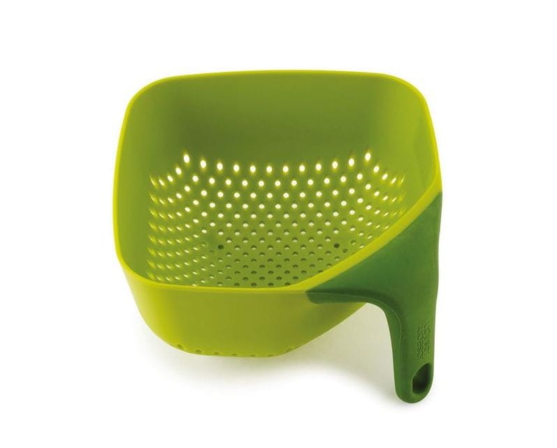 Kwadratowy durszlak z uchwytem. Uchwyt zapewnia stabilizację w zlewie w trakcie płukania, oraz pozwala na trzymanie durszlaka jedną ręką w trakcie mycia. Nowa rączka pokryta silikonem, dzięki czemu durszlak nie wyślizgnie się z dłoni. Durszlak posiada nóżki. Wygodny durszlak sprawdzi się w trakcie odcedzania makaronu, mycia warzyw i owoców. Idealny do mycia małych, delikatnych owoców jak maliny czy borówki.