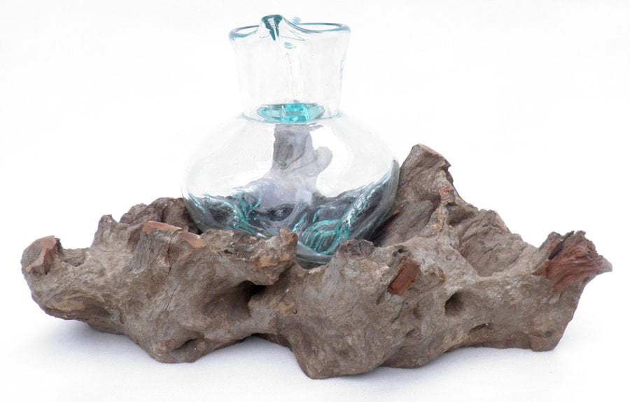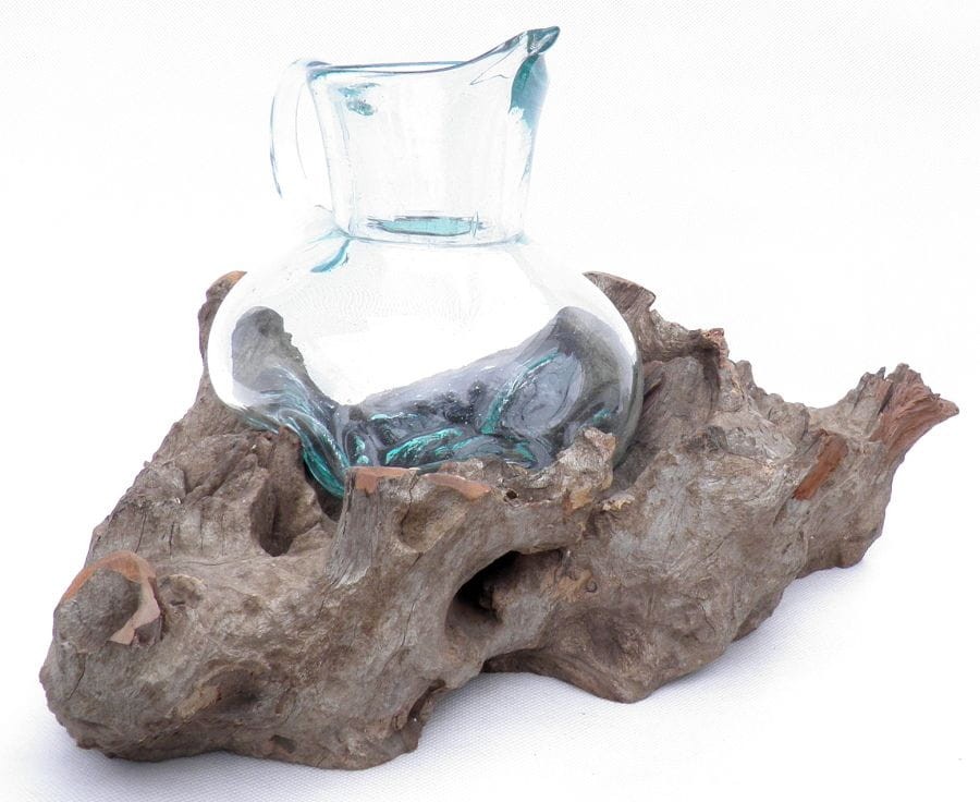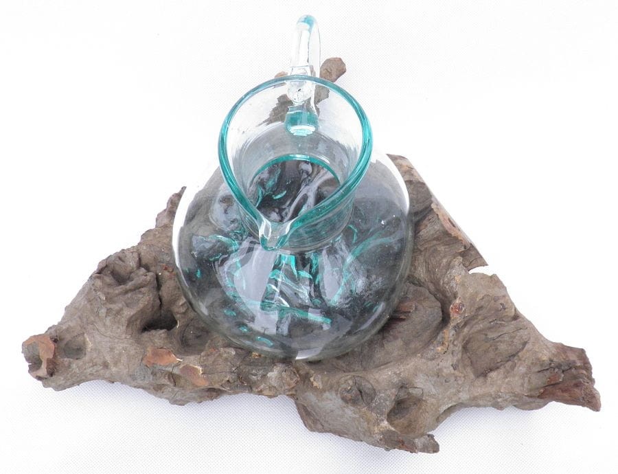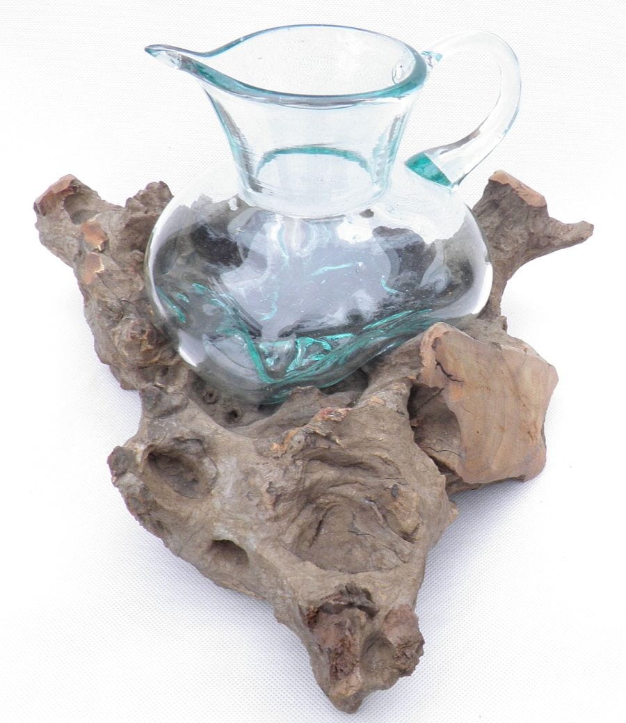 Ręcznie wykonany szklany dzbanek na podstawie z korzenia drzewa tekowego - oryginalna ozdoba każdego wnętrza.