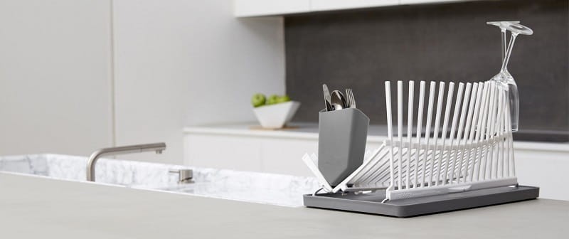 Nowoczesna suszarka z pojemnikiem na sztućce. Specjalnie wyprofilowany odpływ dla łatwego odprowadzania wody z suszarki.
