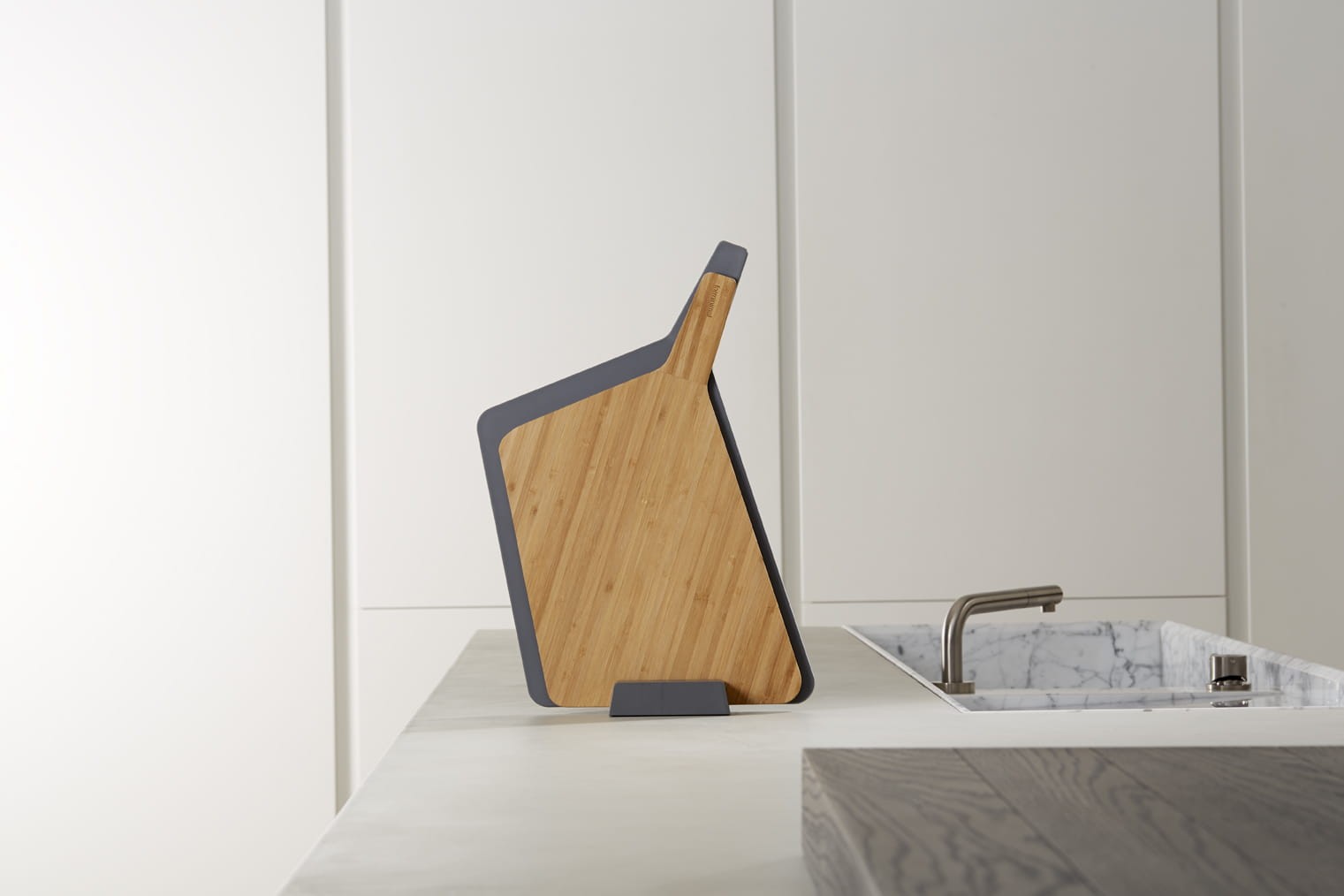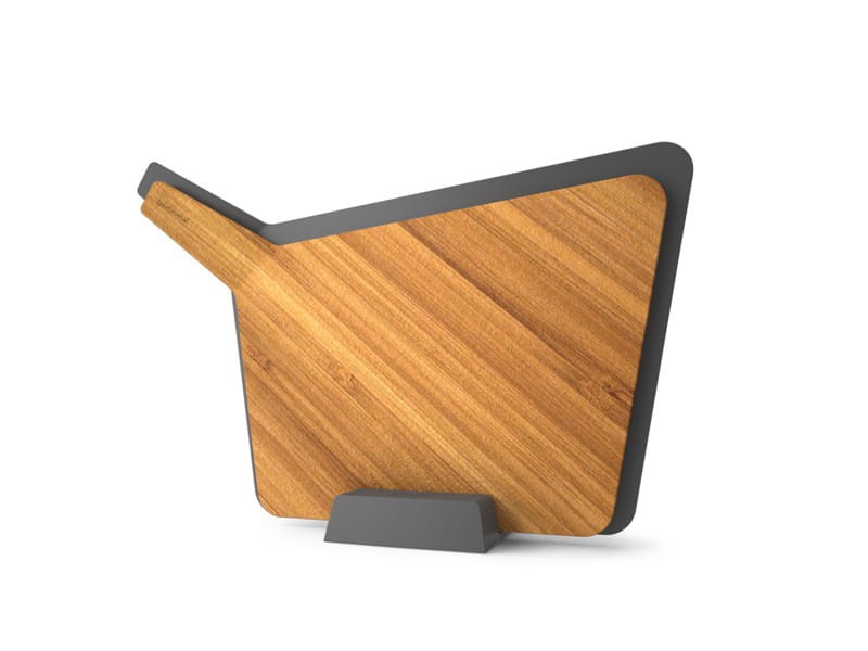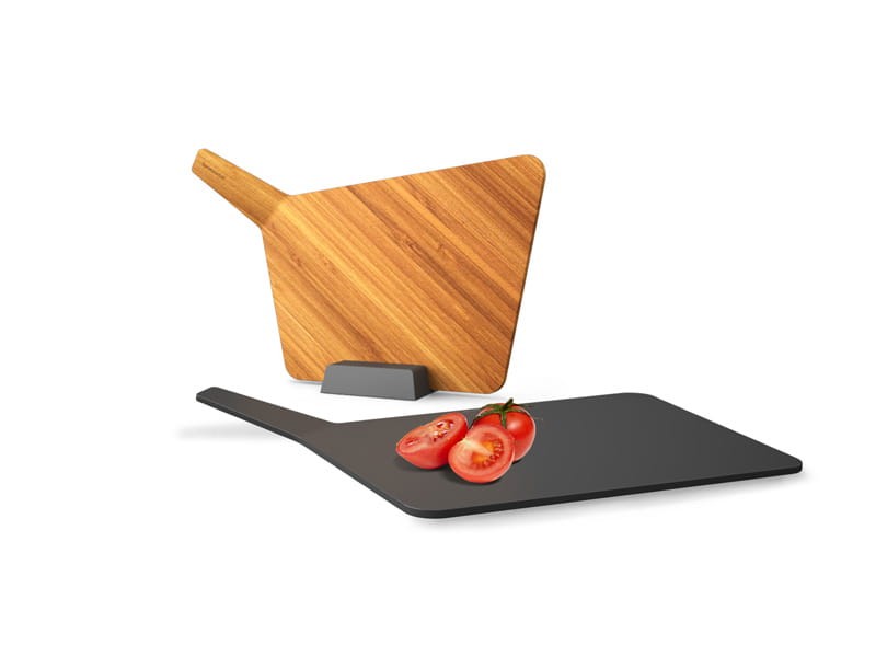 Zestaw desek do krojenia z podstawą. Deski mogą być przechowywane pionowo lub poziomo. Deski posiadają długi uchwyt, dla łatwiejszego wyciągania ich z podstawy.