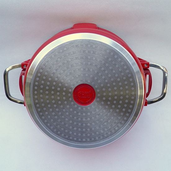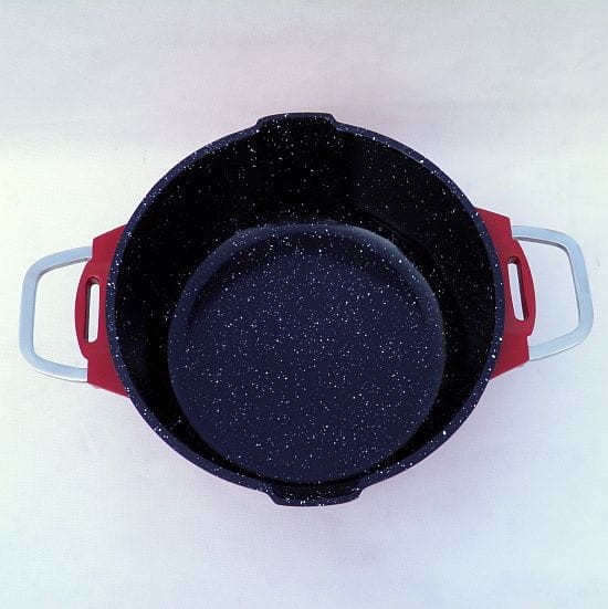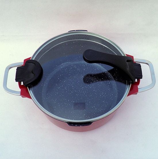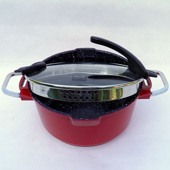 Po obu stronach garnka krawędzie ułatwiające wylewanie bez podnoszenia pokrywki.