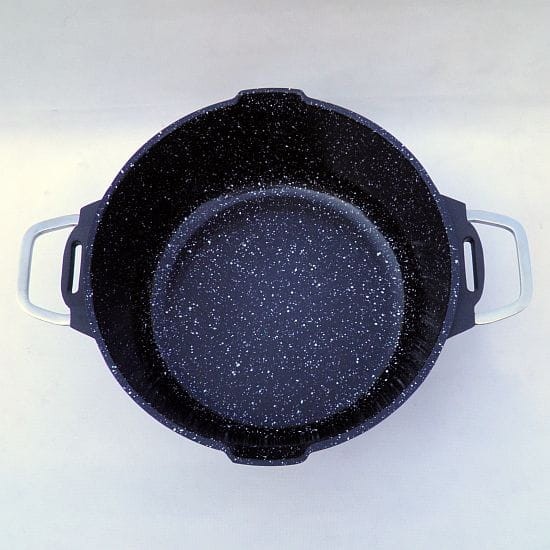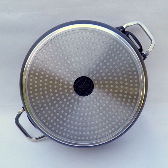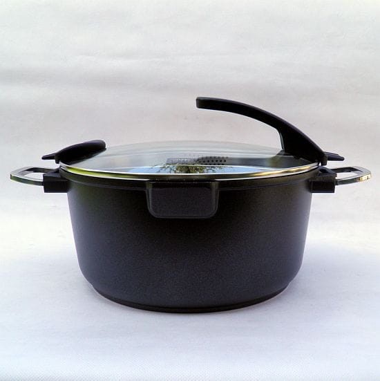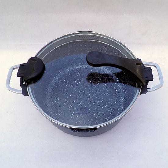 Po obu stronach garnka krawędzie ułatwiające wylewanie bez podnoszenia pokrywki.