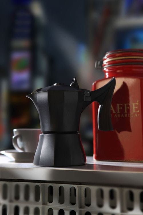 Kawiarka aluminiowa, czarna, lakier termoodporny matowy, czarne uchwyty z tworzywa.