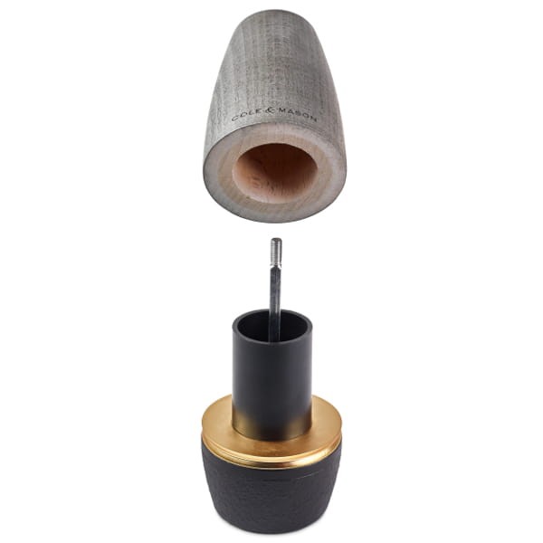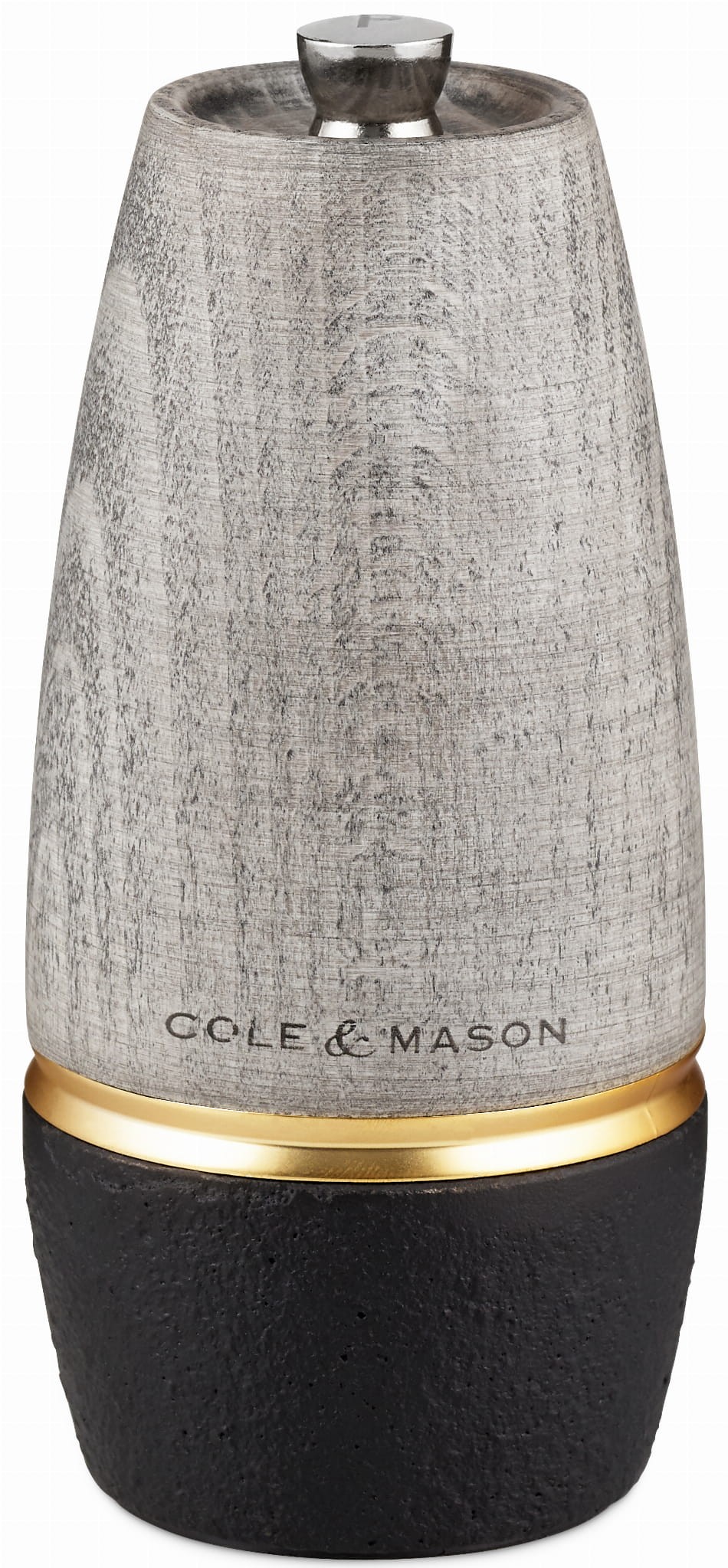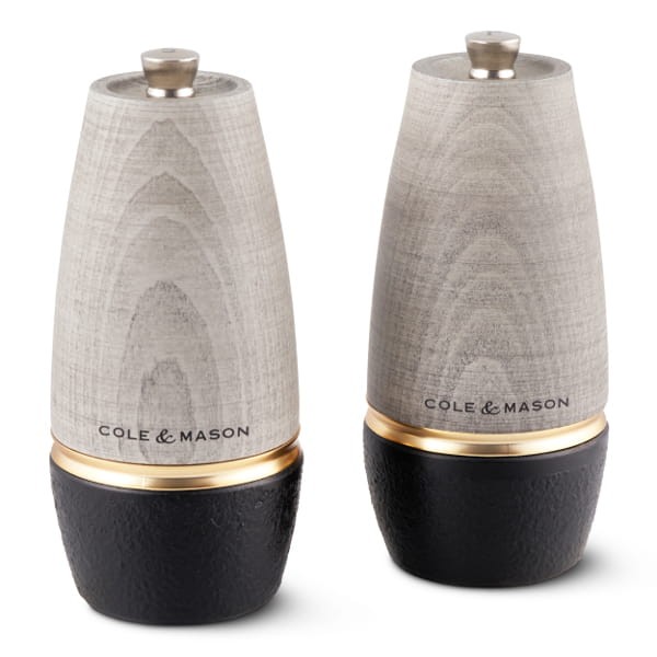 Nowoczesne formy młynków Bridgwater marki Cole & Mason świetnie uzupełniają modnie urządzone wnętrza. Młynki wykonane zostały z drewna bukowego bejcowanego na kolor szary, elementów w kolorze matowego złota oraz żeliwa.