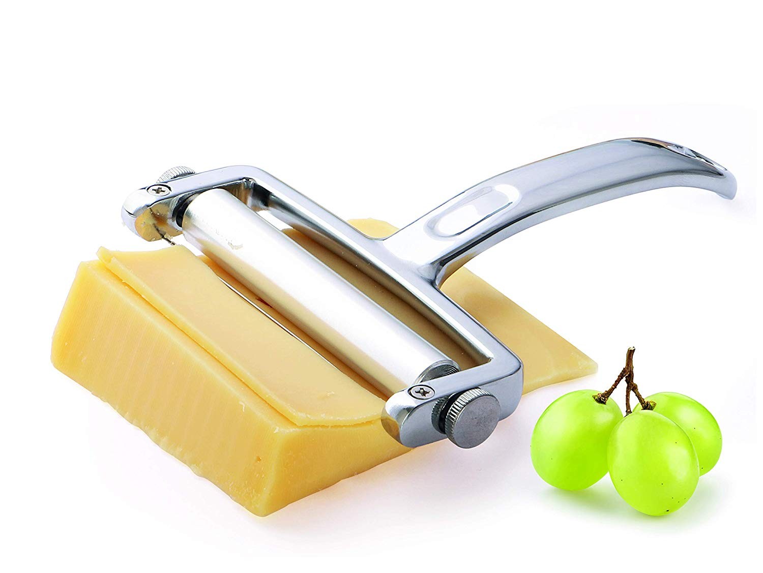 Krajacz do sera Roller niemieckiej marki Weis posiada ostrą, stalową strunę, dzięki której szybko i wygodnie pokroimy na plastry kostkę sera. Nóż nadaje się do krojenia każdego rodzaju żółtego sera np. goudy, sera edamskiego. Szerokość kostki nie może być jednak większa niż 9 cm. Grubość plastrów możemy dostosować za pomocą bocznego pokrętła - może ona wynosić maksymalnie 6 mm. Rączka krajacza jest ergonomiczna, praca z nożem łatwa i efektywna.
