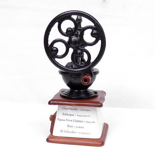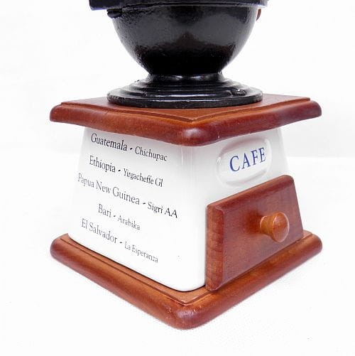 Młynek wykonany z drewna, ceramiki, żeliwa.