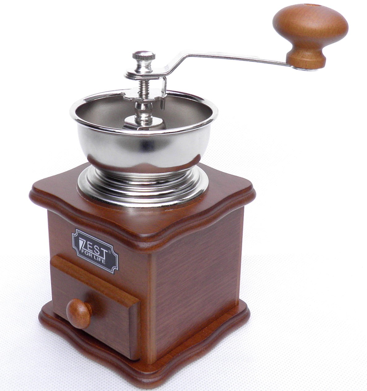 Drewniany młynek do kawy firmy Zest For Life z szufladką na zmieloną kawę. Koło zamachowe lub korbka uruchamiają mechanizm, który mieli kawę. Ta zmielona bezpośrednio przed przygotowaniem posiada świeży, intensywny aromat, a po zaparzeniu charakteryzuje się pełnym smakiem. Jakość młynków docenią prawdziwi miłośnicy kawy!