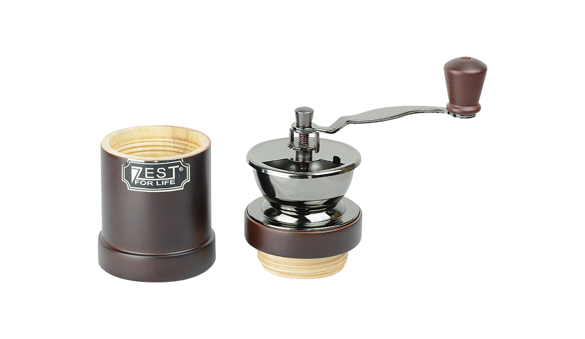 Drewniany młynek do kawy firmy Zest For Life z wykręcanym pojemnikiem na zmieloną kawę. Młynki firmy Zest For Life charakteryzuje oryginalny styl retro. Koło zamachowe lub korbka uruchamiają mechanizm, który mieli kawę. Ta zmielona bezpośrednio przed przygotowaniem posiada świeży, intensywny aromat, a po zaparzeniu charakteryzuje się pełnym smakiem. Jakość młynków docenią prawdziwi miłośnicy kawy!