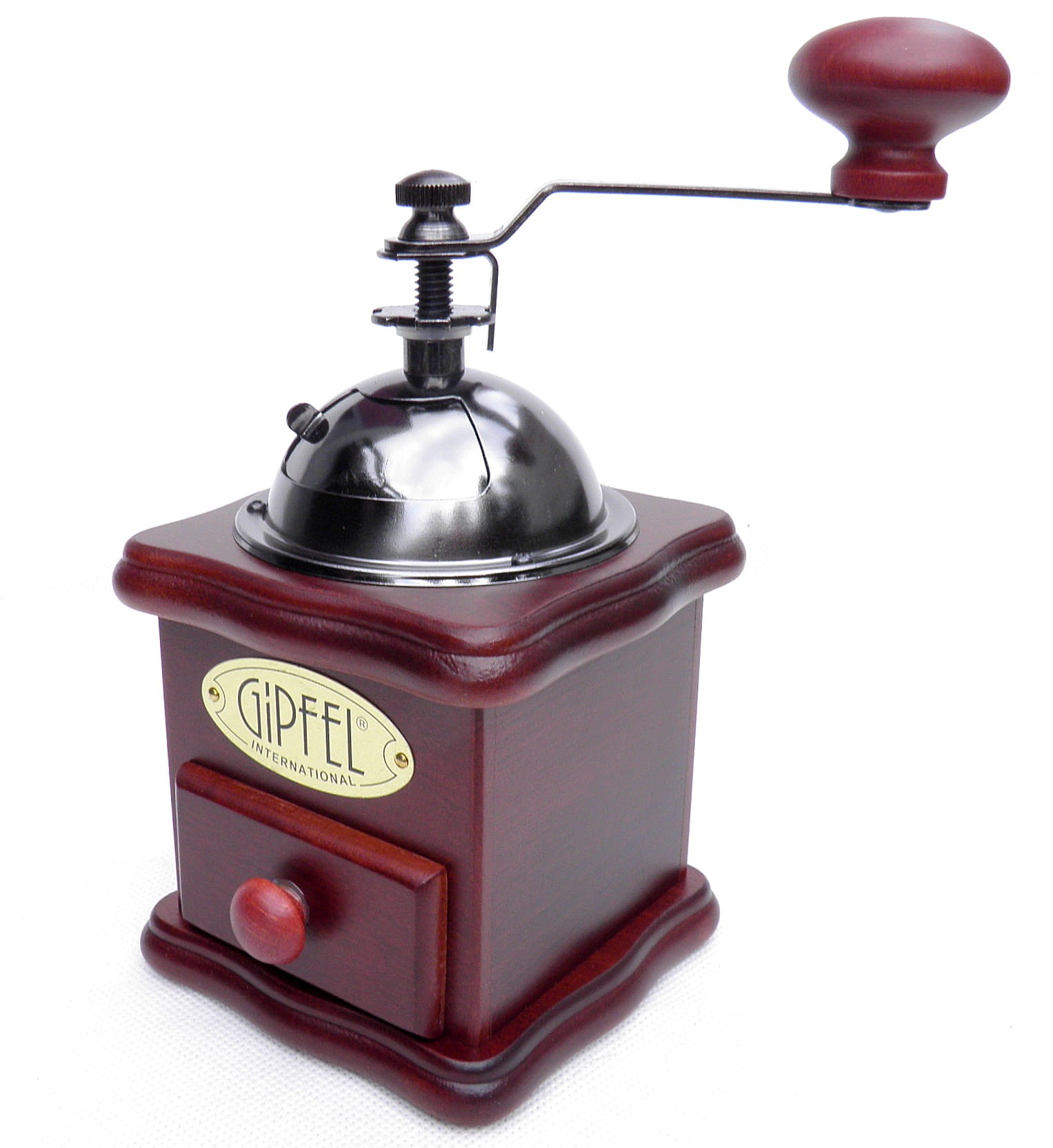 Drewniany młynek do kawy firmy Gipfel z szufladką na zmieloną kawę. Korbka uruchamia mechanizm, który mieli kawę. Ta zmielona bezpośrednio przed przygotowaniem posiada świeży, intensywny aromat, a po zaparzeniu charakteryzuje się pełnym smakiem. Jakość młynków docenią prawdziwi miłośnicy kawy!