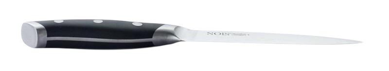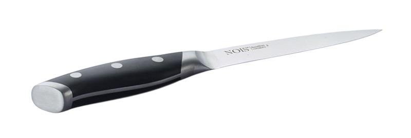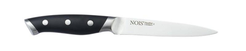 Nóż uniwersalny marki "NOIS" został wykonany z walcowanej stali nierdzewnej X50CrMoV15 o twardości 55 +/- 1 HRC. Konstrukcja i kształt noża zapewniają łatwość użytkowania. Ostre i cienkie ostrze z łatwością przecina produkty o różnej twardości. Gładka, starannie wypolerowana powierzchnia ostrza umożliwia precyzyjne cięcie bez zniekształcania produktów. W miejscu łączenia ostrza z rękojeścią nie gromadzą się bakterie ani brud. Zgrubienie między ostrzem a rękojeścią noża zapewnia bezpieczne oparcie dla palca wskazującego, a także poprawia równowagę pozwalając na długą pracę bez zmęczenia. Nóż ten łatwo ostrzyć.