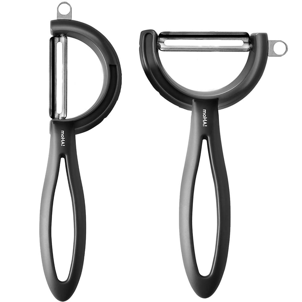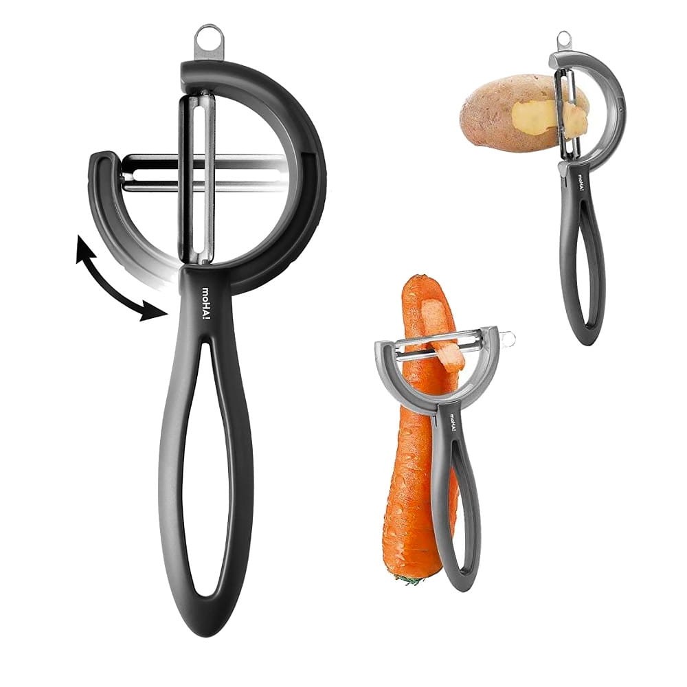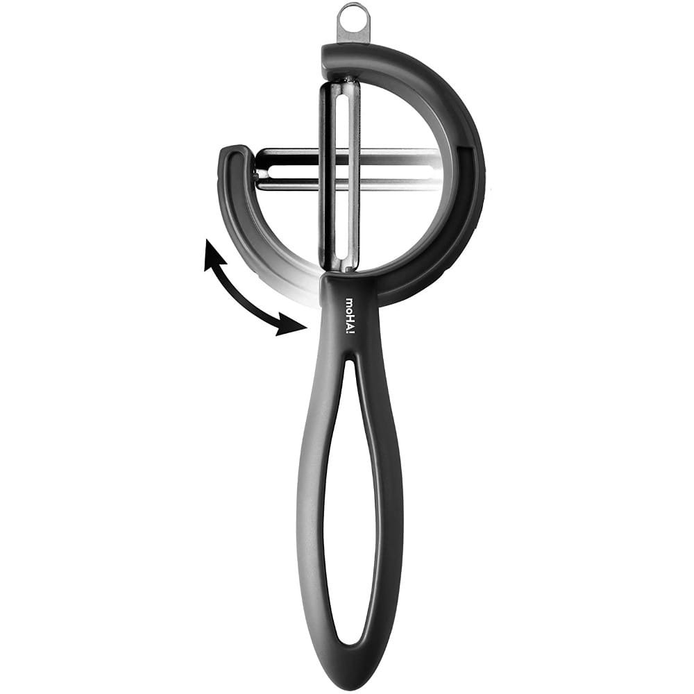 Obieraczka Reverso Veggie ma obrotowe ostrze. Dzięki temu łatwo dostosować ją do Twojego stylu obierania i ułożenia dłoni, ale również do kształtu warzywa. Wiadomo, że podłużne warzywa dużo łatwiej obierać poziomymi ostrzami – przekręcasz tylko ostrze Reverso. Z kolei obierając ziemniaki wygodniejsza jest pionowa obieraczka – obracasz ostrze Reverso do pionu.
