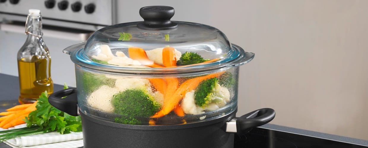 Gotuj zdrowo i oszczędnie, z pomocą parownika! Dwie potrawy w jednym naczyniu - wystarczy na dnie garnka gotować np. zupę lub ryż, a równocześnie w durszlaku umieszczonym na garnku przyrządzać warzywa na parze.