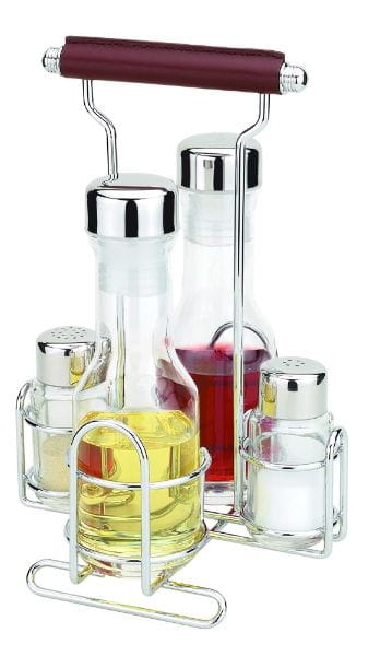 W zestawie: solniczka, pieprzniczka, pojemnik na ocet, pojemnik na oliwę, stojak