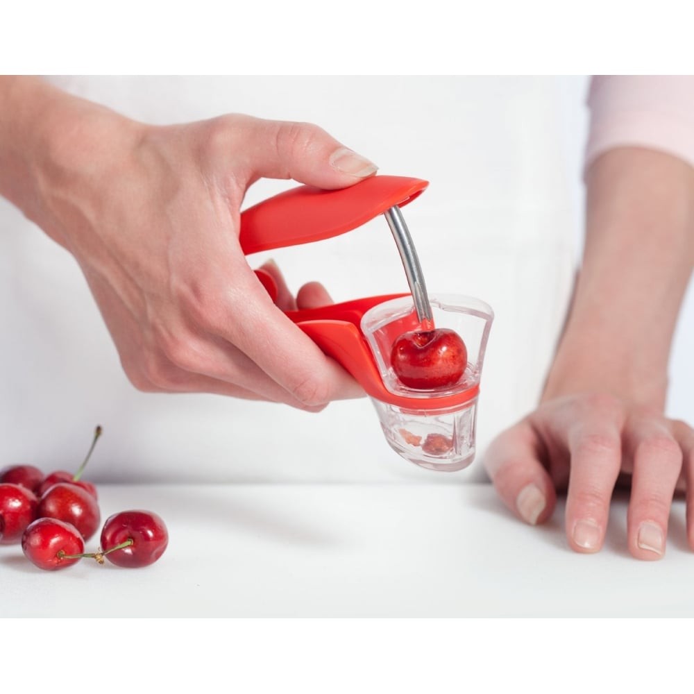 Drylownica do wiśni i oliwek marki Zyliss szybko i łatwo usuwa pestki z małych owoców. Za pomocą jednego ruchu pestka oraz pryskający sok znajdzie się w dopinanym pojemniczku z zachowaniem czystości w kuchni. Jest to narzędzie niezbędne podczas pieczenia ciast z wiśniami lub czereśniami, przygotowywania domowych przetworów lub przekąsek dla dzieci.