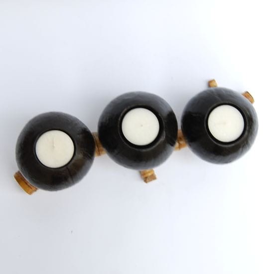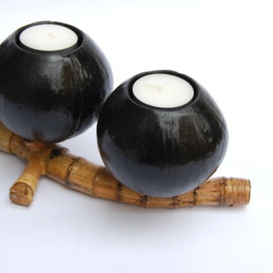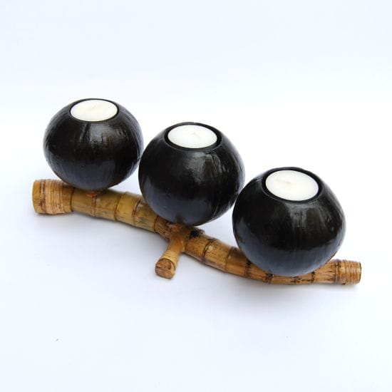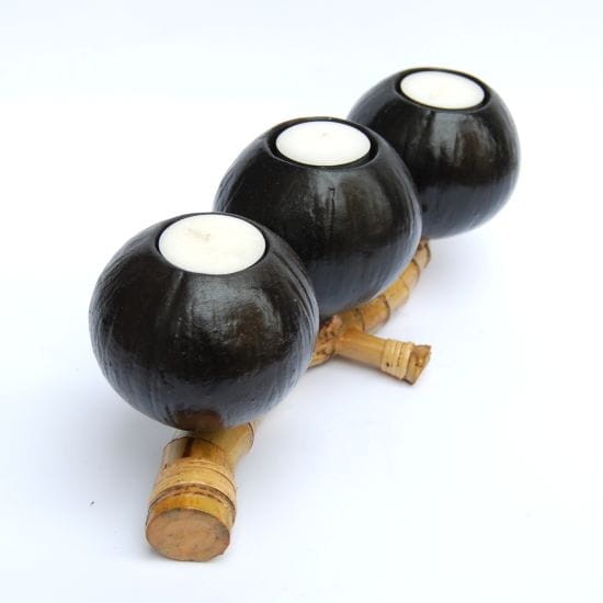 Świeczniki wykonane ręcznie przez indonezyjskiego rzemieślnika, połączenie bambusa z rattanowym oplotem.