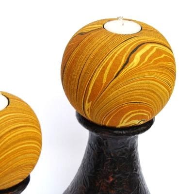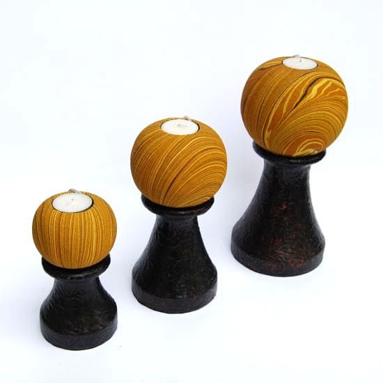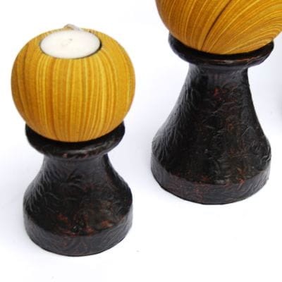 Świeczniki zostały wykonane ręcznie z egzotycznego drewna, dekorowane piaskiem.