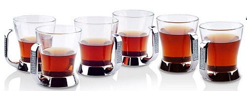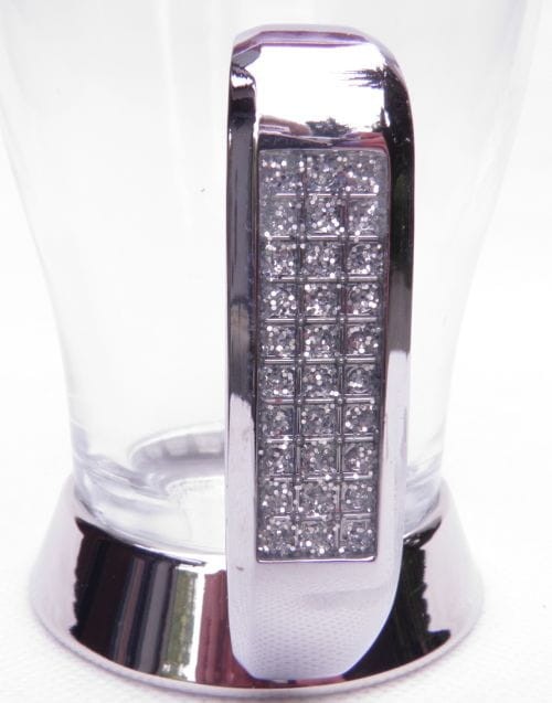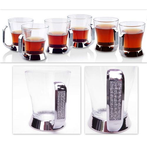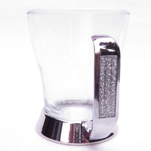 Szklanki w koszyczku metalowym ze stali nierdzewnej 18/10 polerowanej na wysoki połysk. Z pięknym zdobieniem cyrkoniami, które są zatopione w żywicy i obsadzone w ramce.