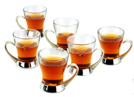 Szklanki w koszyczku metalowym ze stali nierdzewnej polerowanej na wysoki połysk.