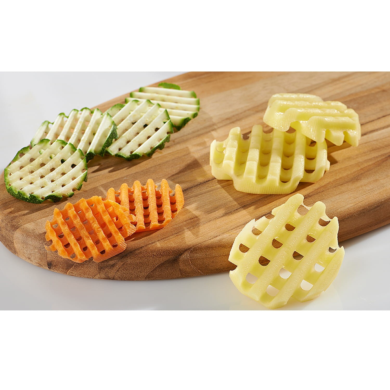 Tarka waflowa Wafel niemieckiej marki Borner pozwala uzyskać faliste plastry lub efektowną kratkę. Ozdobna mizeria, surowe bądź smażone warzywa czy frytki to kolejna okazja by zaskoczyć gości, ale i doskonały sposób na małego niejadka. Wycięte w kratkę warzywa nie tylko ładnie się prezentują (ozdoba talerzy z wędlinami lub serami), ale też umieszczone w sałatce nabierają lepszego smaku - intensywniej przechodzą aromatami sałatkowych dipów.