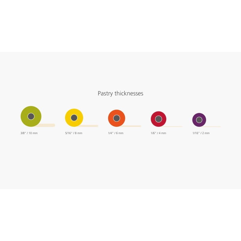 - 5 zestawów zdejmowanych, kolorowych pierścieni umożliwiających precyzyjne ustawienie grubości ciasta: 2 mm, 4 mm, 6 mm, 8 mm i 10 mm
