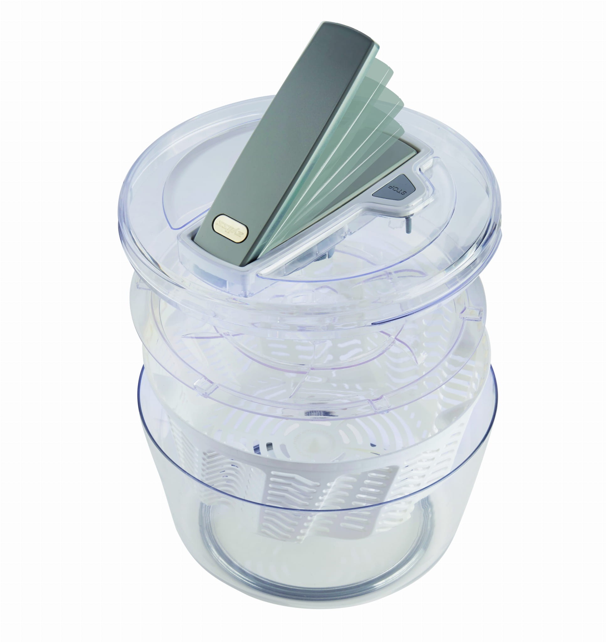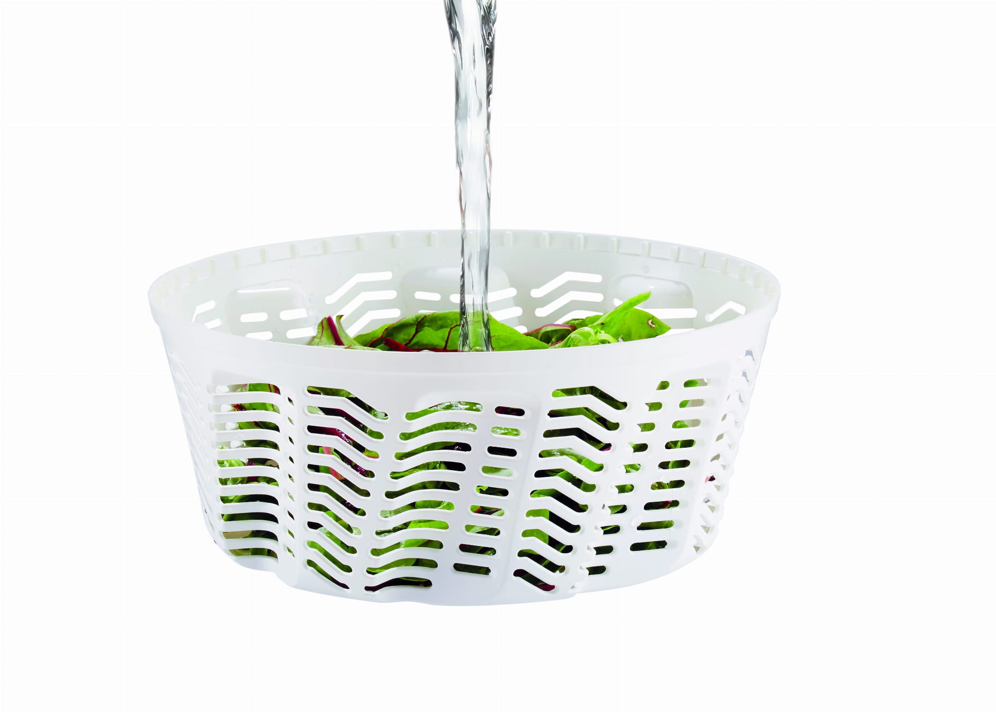 System działania pozostał taki sam, po prostu naciskaj dźwignię do dołu i patrz jak woda zostaje odwirowana z sałaty. Szybko, sprawnie i bez wysiłku. Teraz jednakże wirówka odwiruje do 25% więcej wody z sałaty w krótszym czasie i co za tym idzie przy mniejszym wysiłku (w porównaniu do innych konkurencyjnych modeli dostępnych na rynku). Nowy kształt wewnętrznego koszyka oraz ulepszony mechanizm obrotowy gwarantuje lepsze efekty.