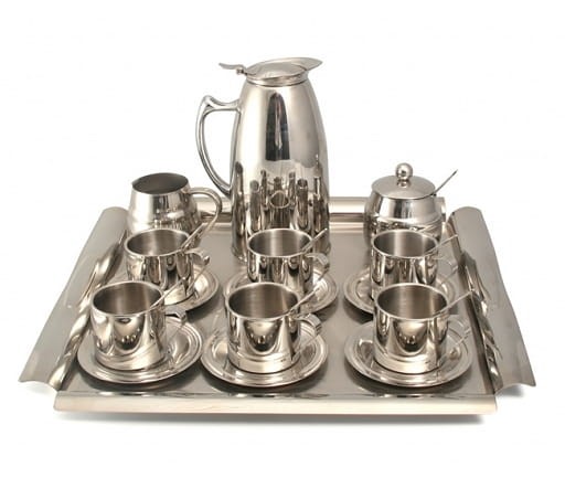 Luksusowy zestaw do serwowania kawy. Wykonany z wysokiej jakości stali szlachetnej 18/10. Z zewnątrz polerowany na wysoki połysk, wewnątrz satynowy, renomowanej firmy Gipfel. Model 8555. Zapakowany w eleganckim pudełku firmowym, prezentowym. Idealny na prezent.