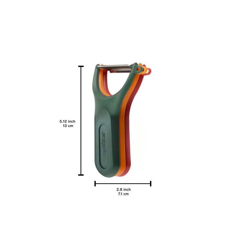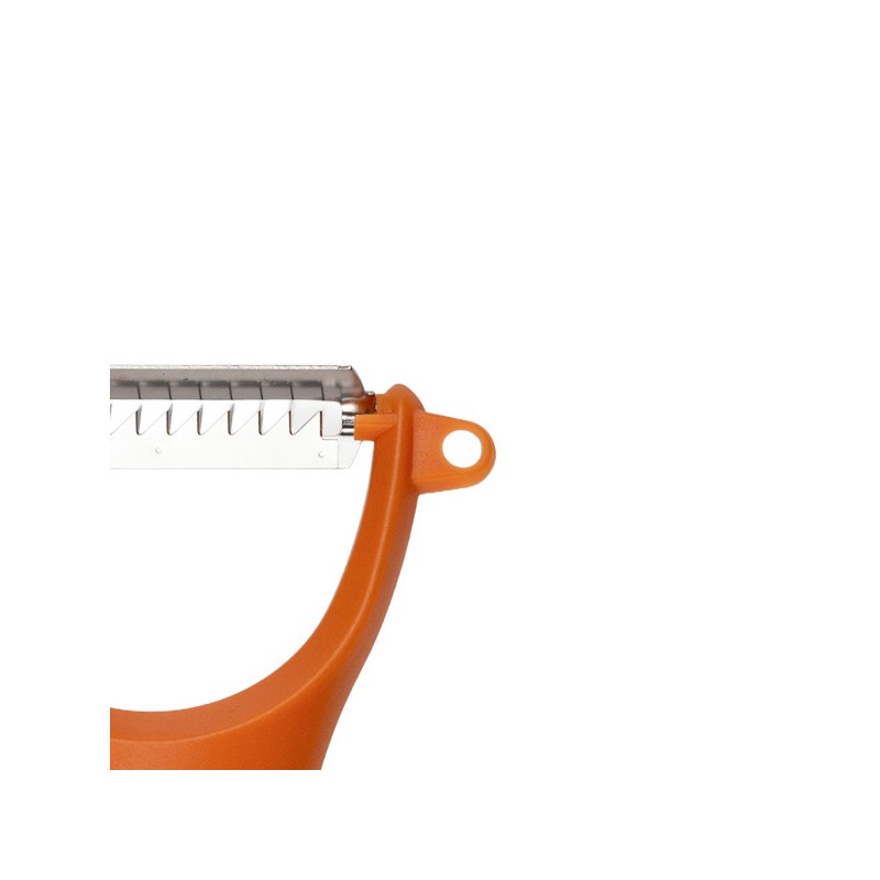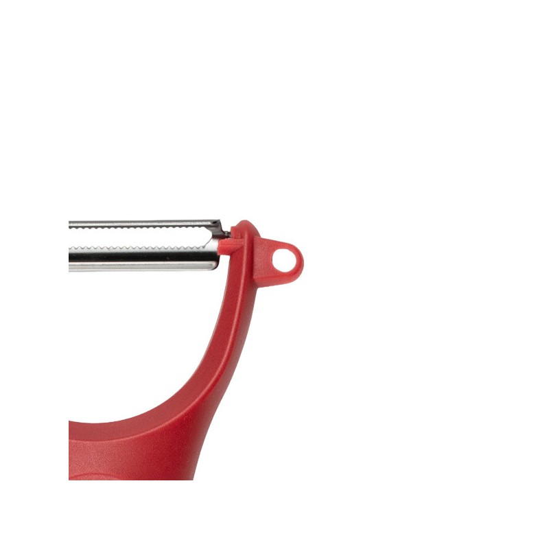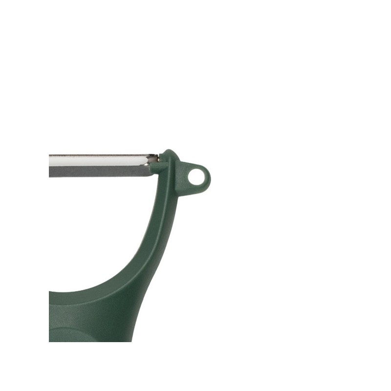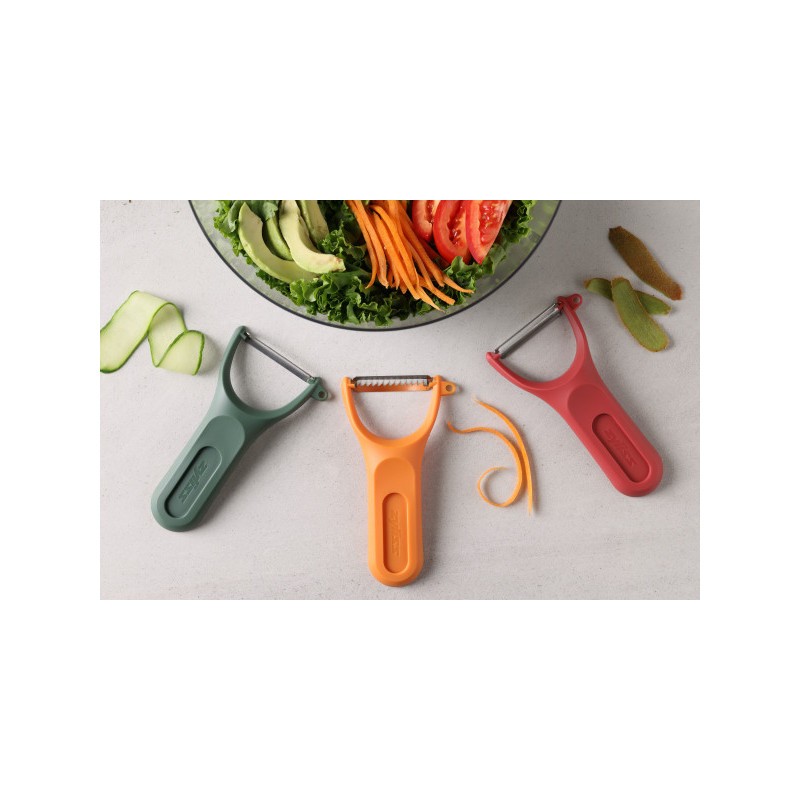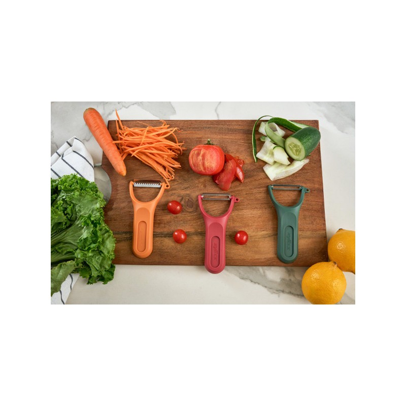 Każda obieraczka posiada ergonomiczny, kolorowy uchwyt ułatwiający szybkie rozpoznanie właściwego narzędzia. Wbudowany wycinak oczek pozwala łatwo usuwać niedoskonałości z warzyw i owoców. Dzięki kompaktowej, spinanej konstrukcji wszystkie trzy obieraczki można przechowywać razem, co pomaga utrzymać porządek w kuchennej szufladzie.