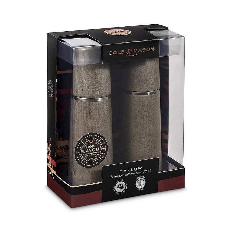 Nowoczesne formy młynków Marlow marki Cole & Mason świetnie uzupełniają modnie urządzone wnętrza. Młynki wykonane zostały z drewna bukowego bejcowanego na kolor szary. Pięknie zapakowany komplet idealnie nadaje się na prezent na każdą okazję.